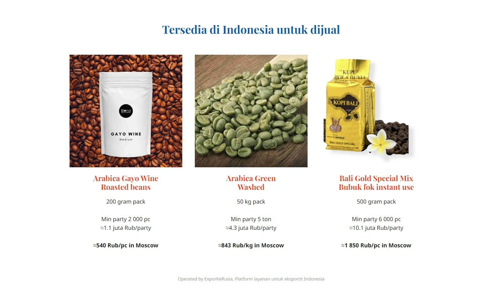 Agar pembeli Rusia yang telah mengunjungi situs showcase ini dapat dengan cepat memahami apakah dia ingin membeli, harga akan ditunjukkan dalam prinsip "sudah di Rusia". Mitra Rusia akan mengurus ini, setelah menghitung terlebih dahulu semua biaya logistik dan bea cukai. Dengan demikian, hampir secara real time, produsen kopi Indonesia akan dapat menjual produknya, dan mendapatkan keuntungan yang wajar.